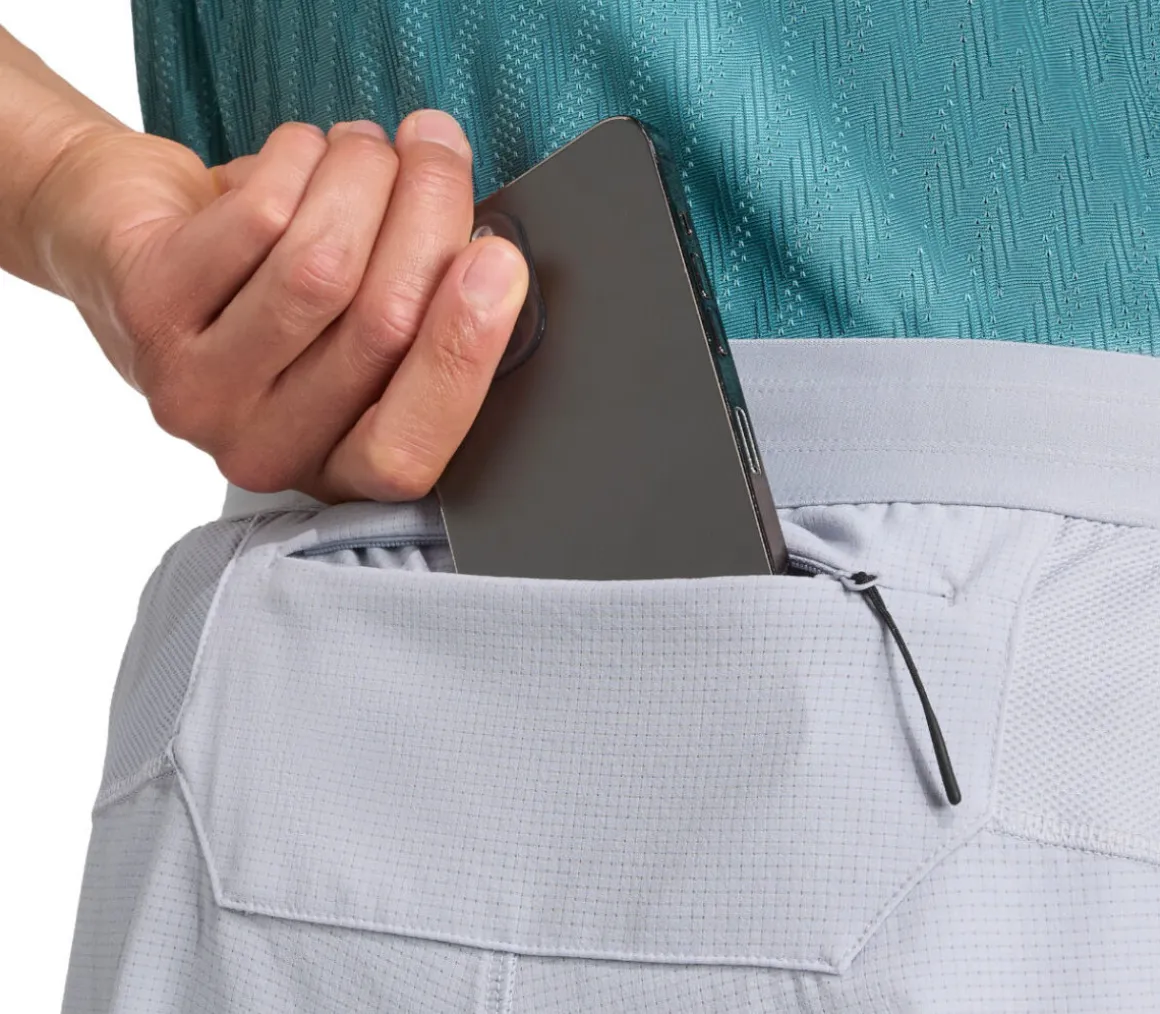 Lo short ha una girovita elasticizzato, grazie ad una fascia elastica; presenta degli spacchetti laterali per assicurare ampia libertà di movimento e una tasca posteriore con zip per riporre gli oggetti più importanti.