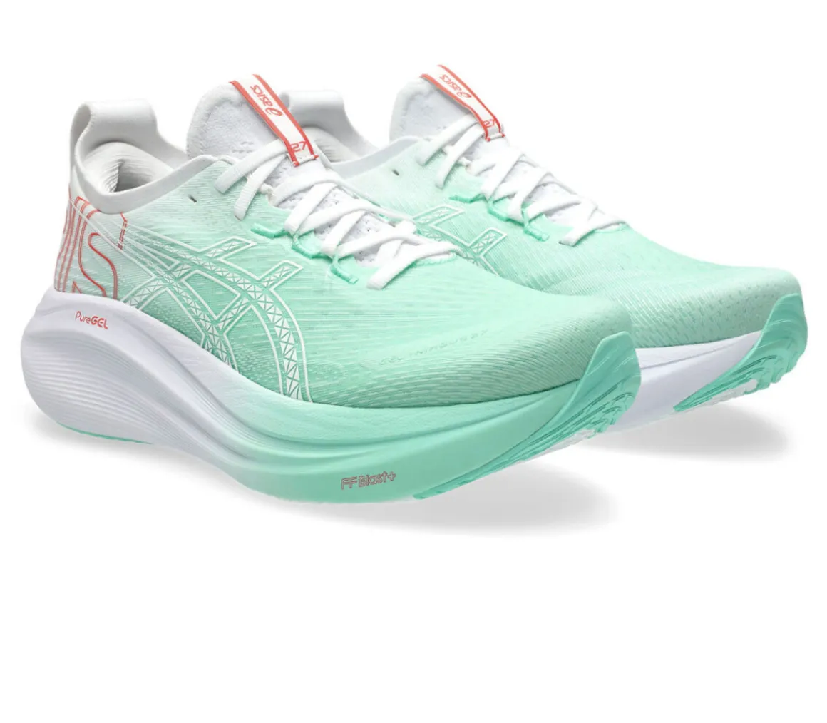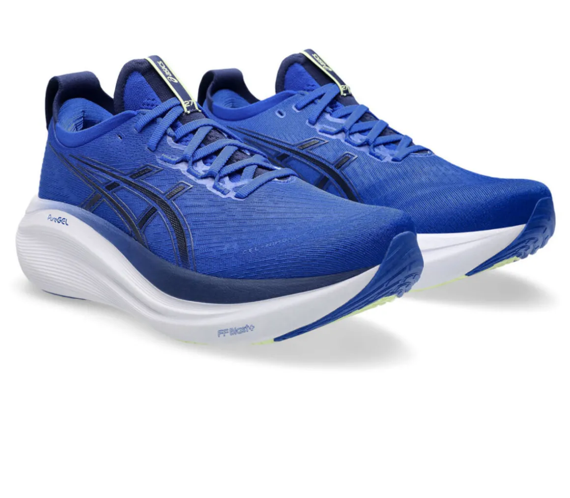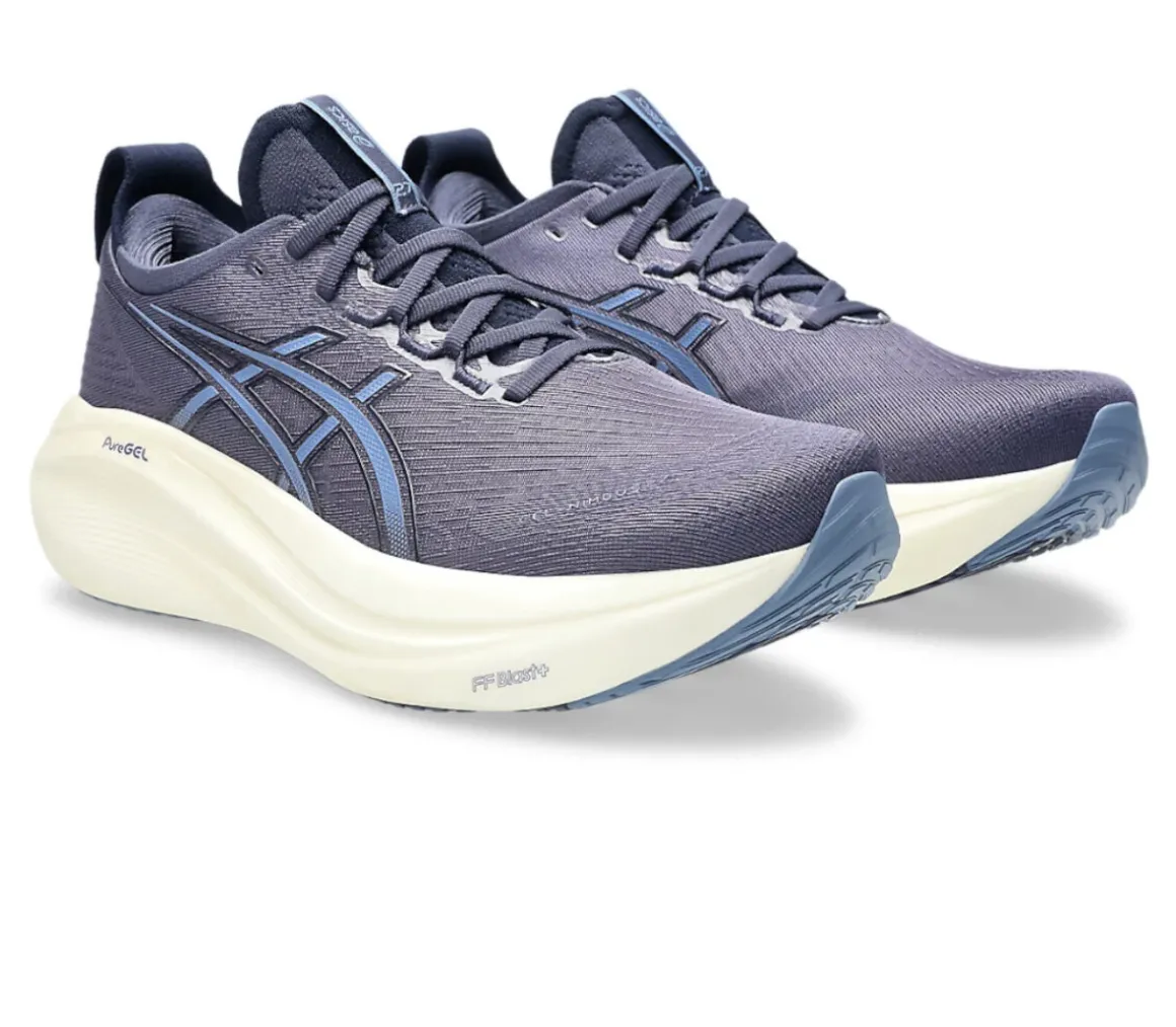La Asics Gel Nimbus 27 è una scarpa perfettamente ammortizzata e confortevole, grazie al cushioning della schiuma FF BLAST PLUS ECO e alla morbidezza della tecnologia PureGel.