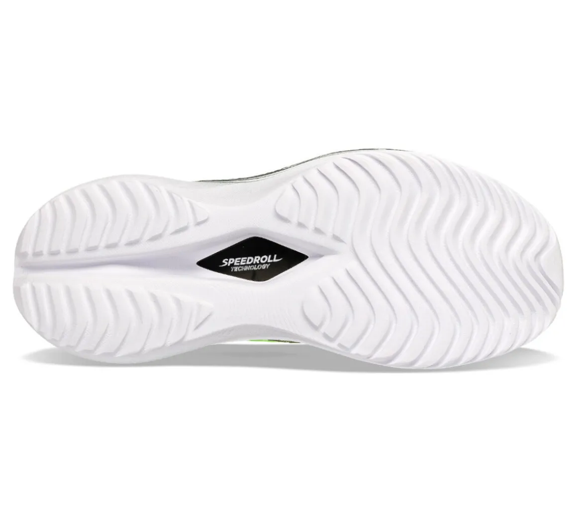 Unita alla piastra in fibra di carbonio (inserita su 3/4 dell’intersuola) il design Speedroll della suola accompagna la falcata in ogni fase, dall’appoggio fino alla spinta, con un movimento più fluido ed efficiente in gara e in allenamento.