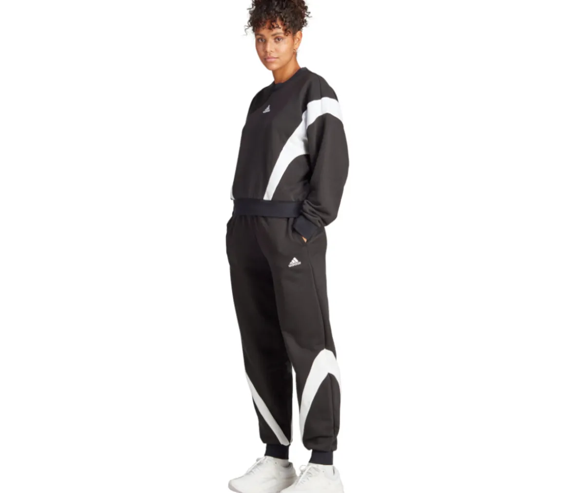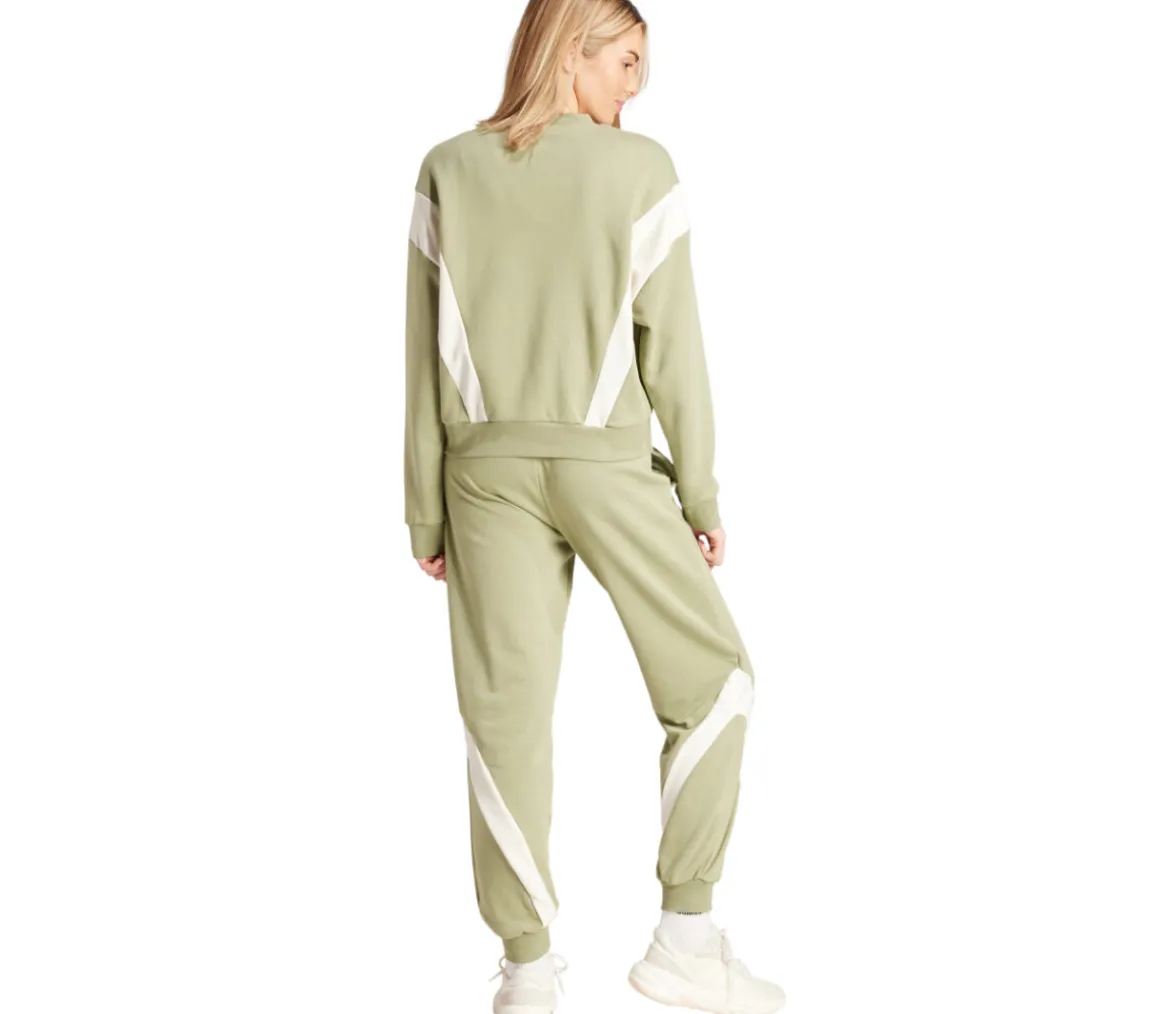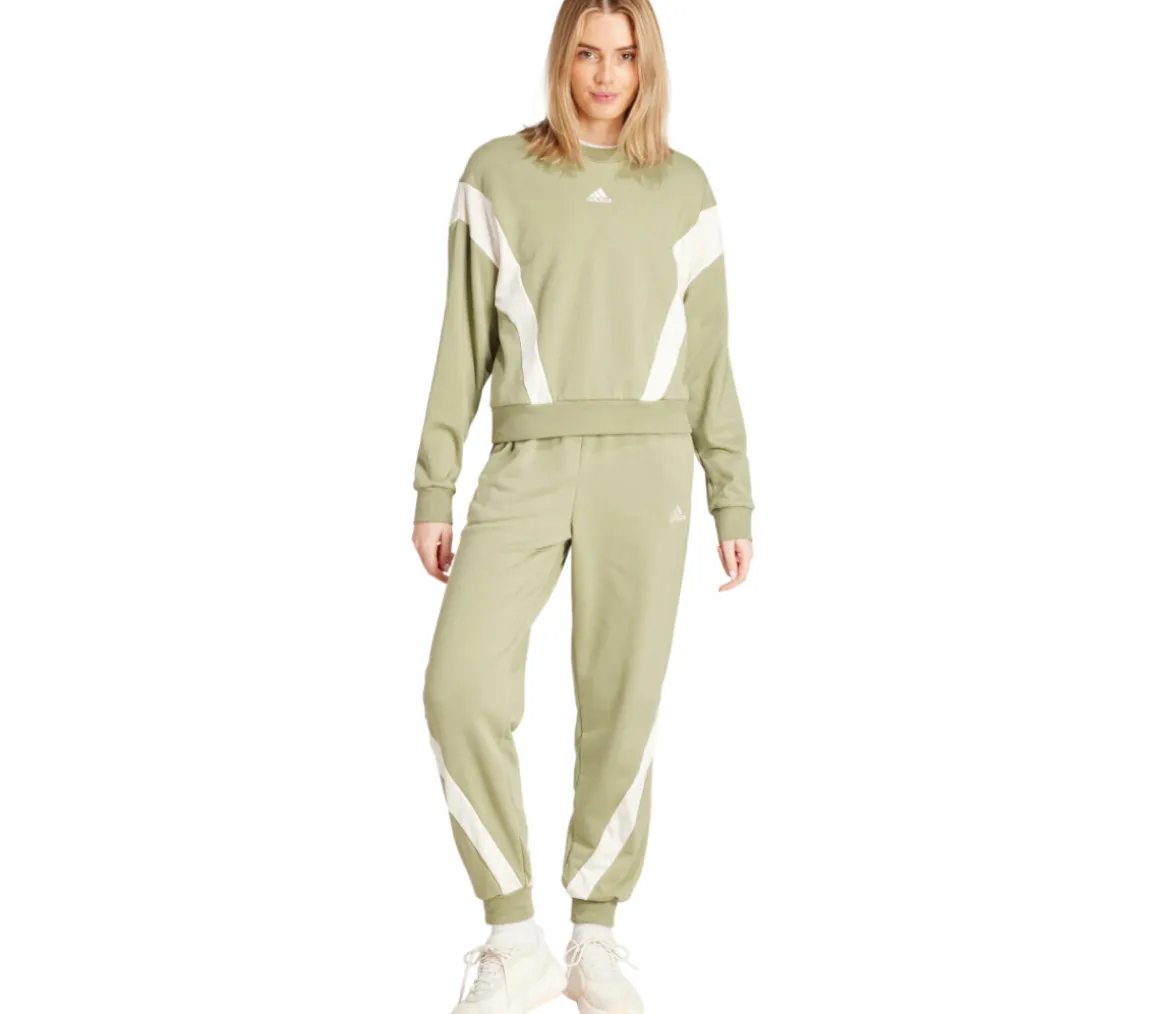 La tuta ha una vestibilità ampia, i pantaloni hanno una vestibilità regolare con tasche laterali e girovita elasticizzato. La felpa è girocollo e presenta i polsini a coste.