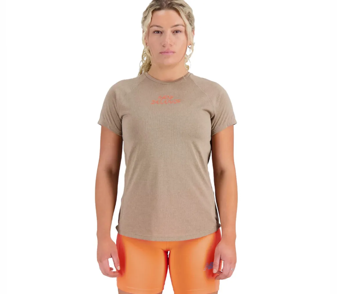 La maglietta Printed Impact Run Short Sleeve da donna è in materiale traspirante, dal taglio sportivo, avvolgente ma non aderente. La tecnologia premium NB DRYx mantiene la pelle asciutta e fa traspirare il sudore.