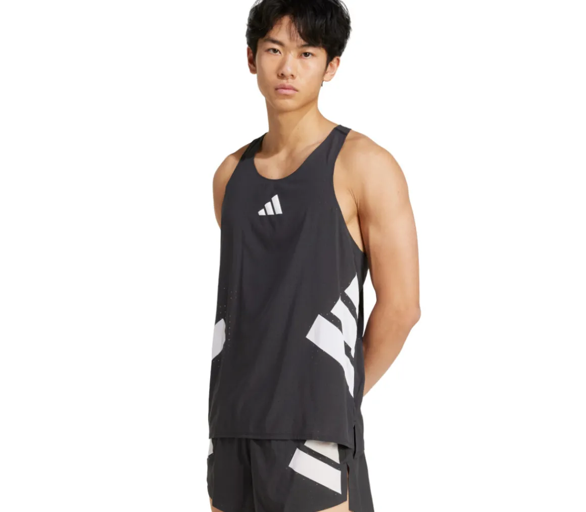 La canotta è smanicata e con uno scollo all’americana per consentire il massimo movimento delle braccia; la lunghezza è standard e sono presenti le iconiche strisce Adidas.
