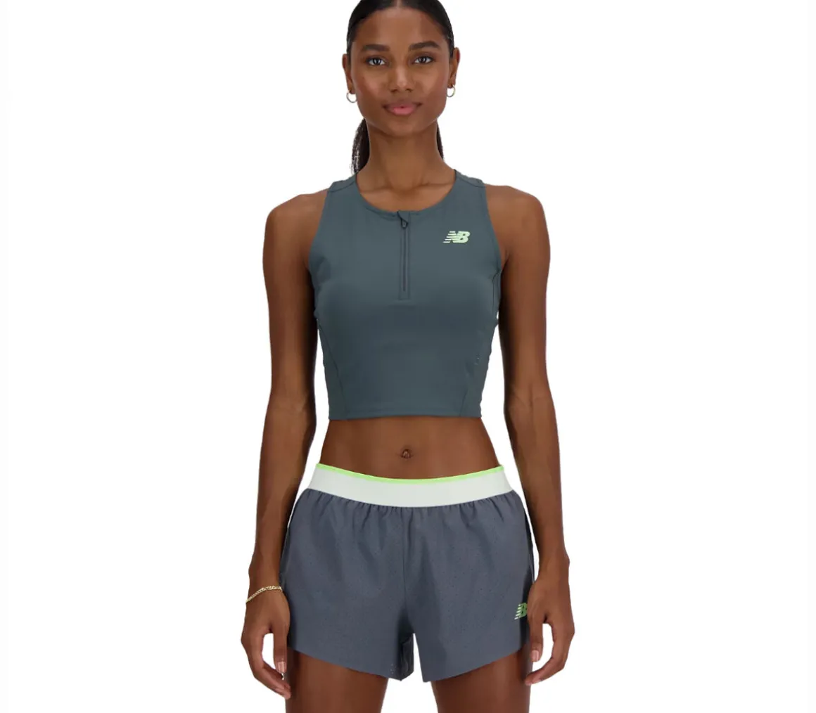 Il top New Balance Sleek Race Day Fitted Tank da donna è progettato con la tecnologia NB DRYx, che fa evaporare il sudore per mantenere la pelle asciutta.