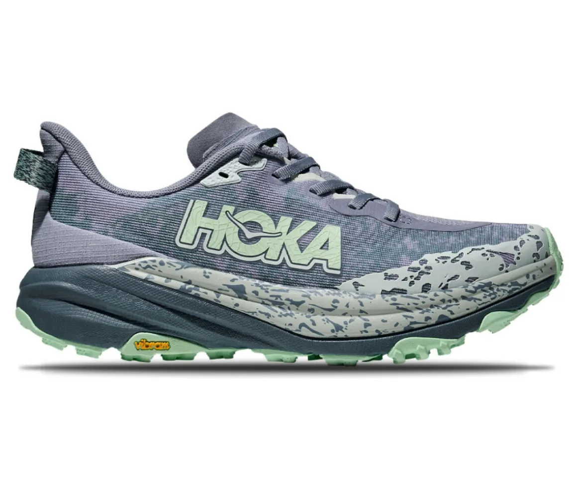 La Hoka Speedgoat 6 è una scarpa da trail running per le runner medio leggere che si allenano su sentieri rocciosi e tecnici, grazie alla protezione del battistrada Traction Lug.