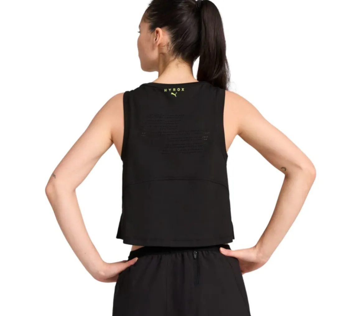 Il top è girocollo e smanicato, la lunghezza è al punto vita; sul retro sono presenti dei micro fori sul tessuto che permettono una ventilazione perfetta durante gli allenamenti di HYROX.