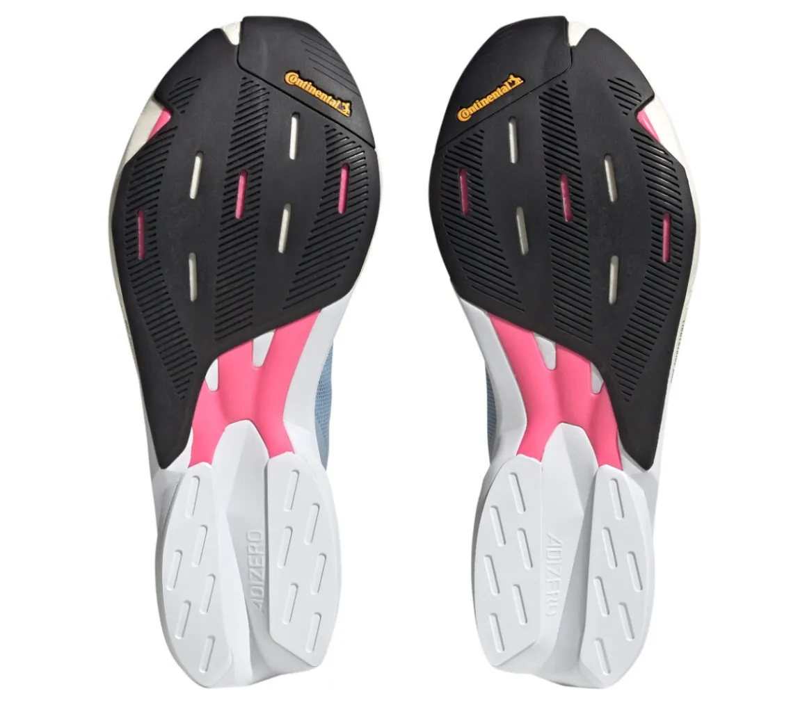 La Adizero Adios 8 offre ammortizzazione e transizioni fluide grazie alla combinazione della mescola Lightstrike Pro e la mescola Lightstrike Pro 2.0, che assorbono l’impatto con il terreno e restituiscono energia durante lo stacco.