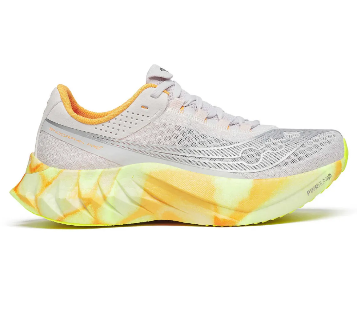La Saucony Endorphin Pro 4 è adatta per le gare di velocità, grazie alla falcata veloce della piastra in carbonio e al grande ritorno di energia della schiuma PWRRUN PB.
