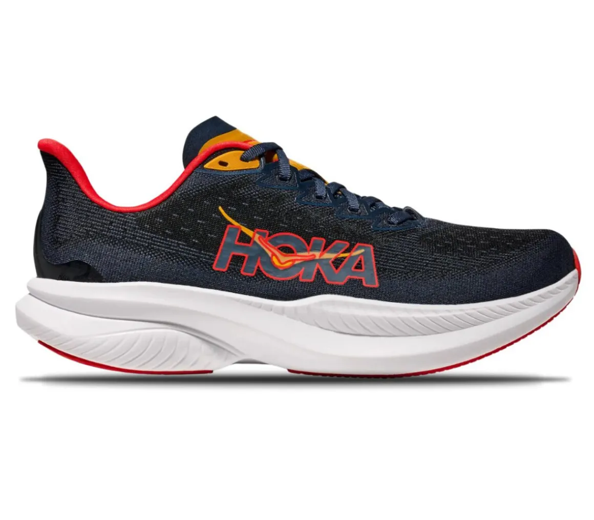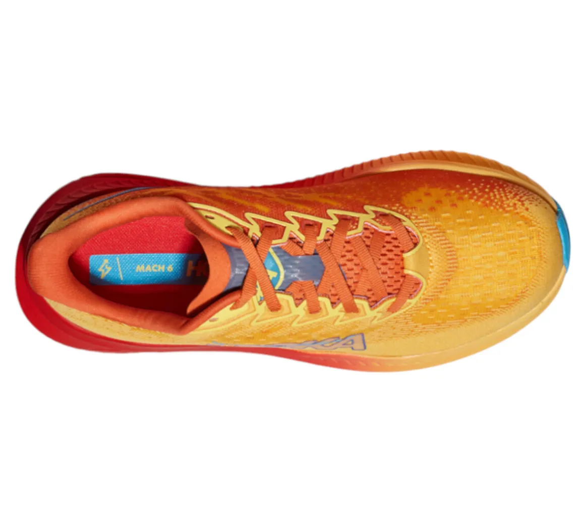 La Hoka Mach 6 è una scarpa leggera e reattiva, grazie all’intersuola in Eva e al MetaRocker, che assicurano supporto e velocità durante l’allenamento.