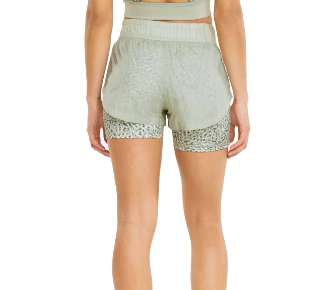 Lo short ha la vita alta, è costituito dal pantaloncino interno in morbido rivestimento, banda elastica in vita e sovra-pantaloncino sagomato.
