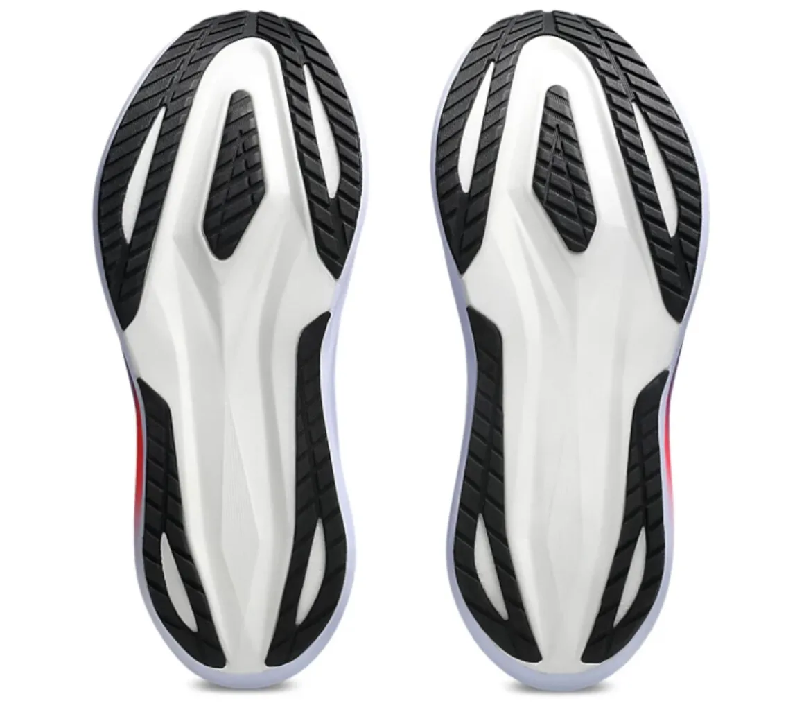 La suola in gomma AsicsGrip presenta un battistrada con più scanalature nella zona del tallone, che migliorano la flessibilità e l’aderenza con le superfici asfaltate. Inoltre, il design della suola inspirato ai trampolini aumenta la sensazione di rimbalzo.