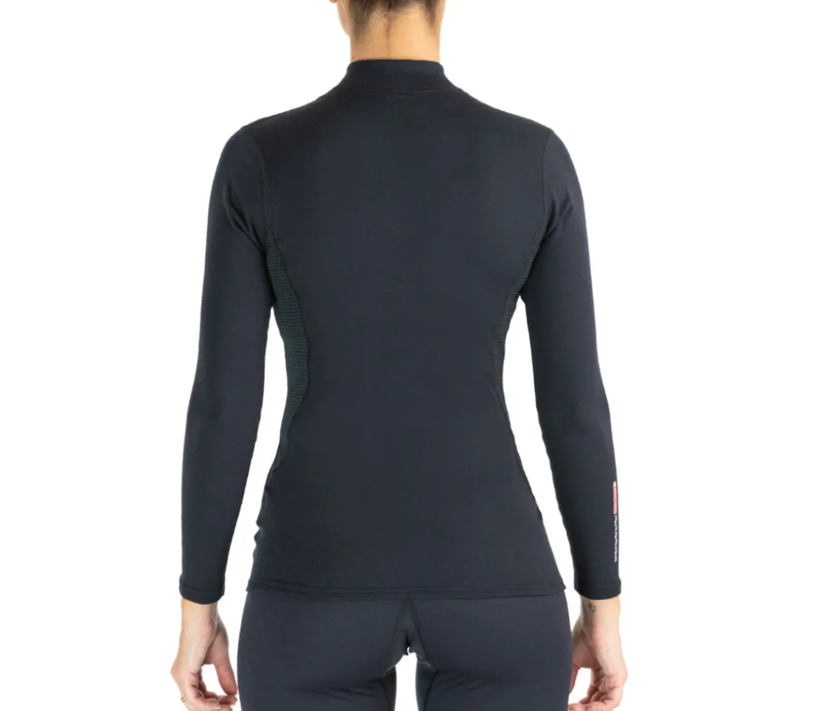 La maglia ha le maniche lunghe e si apre con una mezza cerniera sul collo. Le cuciture sono piatte ed ha degli inserti traspiranti all’altezza delle ascelle e nella parte interna del braccio.