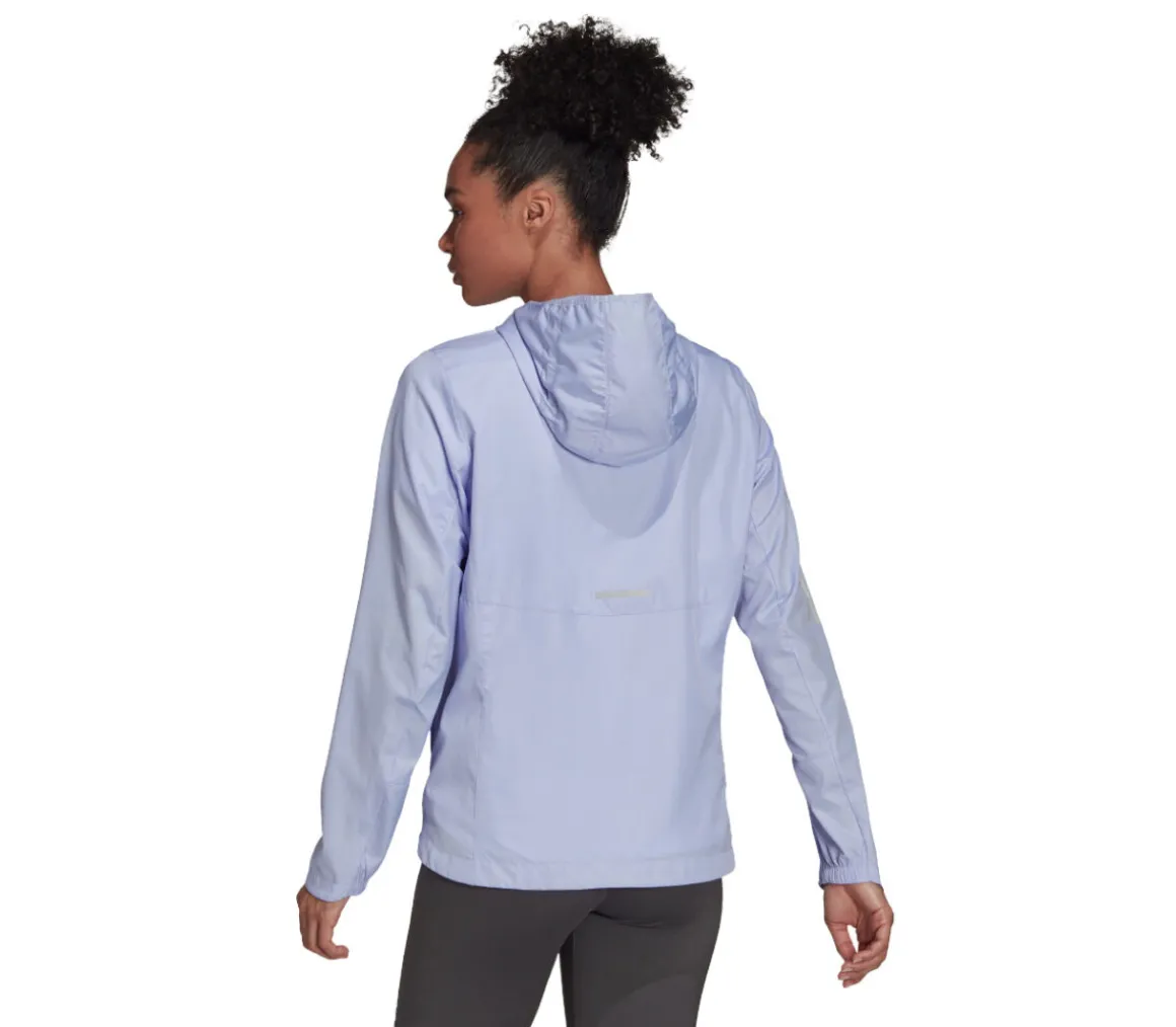 Giacca da donna con cappuccio Adidas Own The Run, ideale per la stagione invernale grazie al suo tessuto impermeabile e ai dettagli riflettenti che garantiscono visibilità anche nelle ore notturne o in condizione di poca luce.