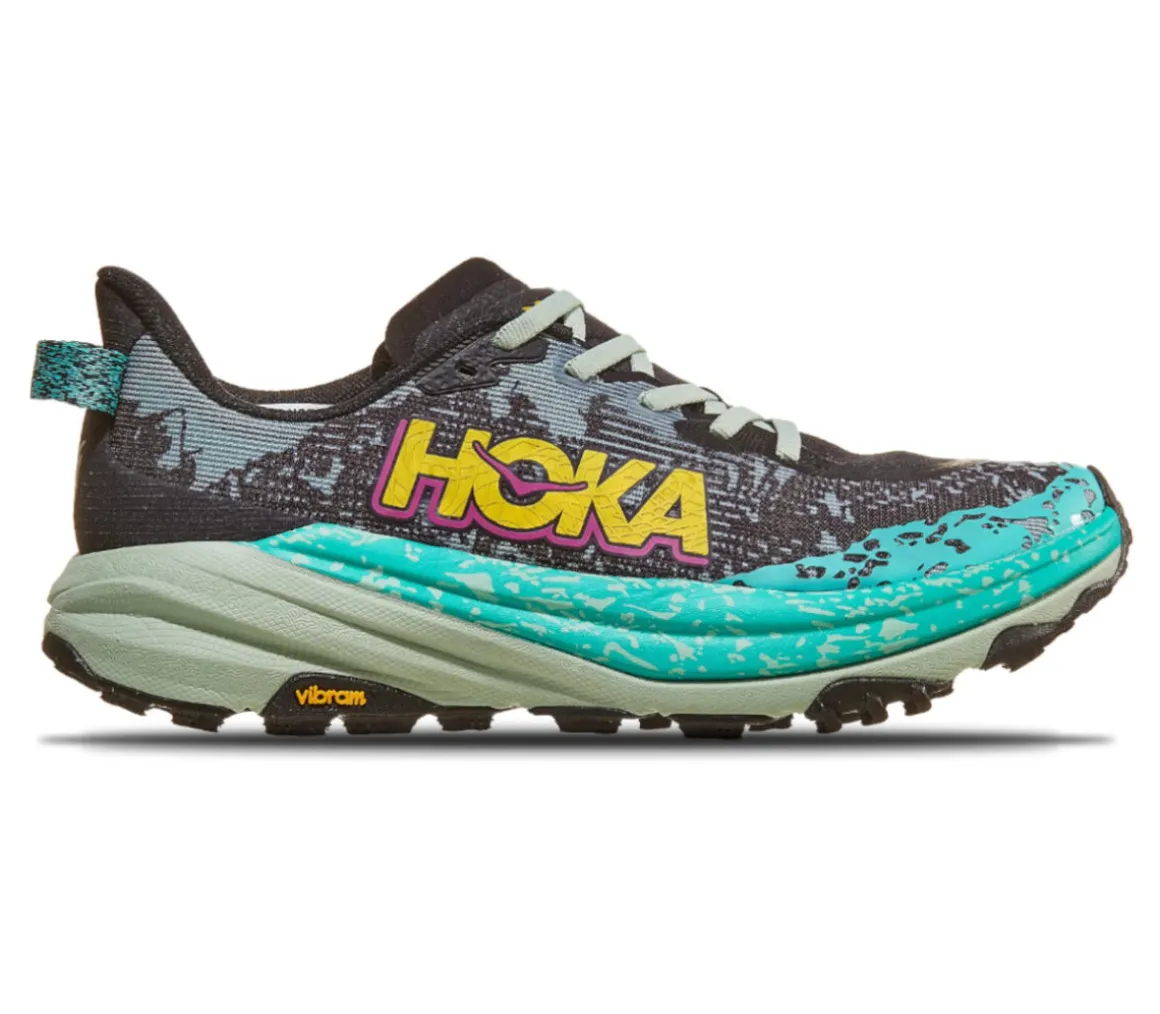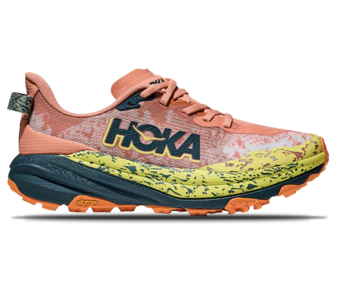La Hoka Speedgoat 6 è una scarpa leggera e sicura per affrontare i trail tecnici, grazie alla spinta reattiva dell’intersuola Cmeva e il supporto e la protezione della suola in Vibram Megagrip.