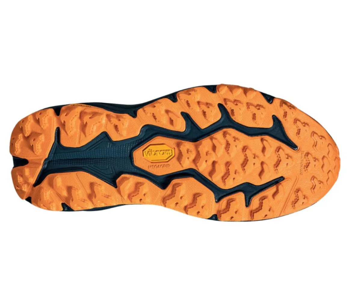 La suola in Vibram Megagrip presenta una tacchettatura Traction Lug da 5 mm che assicura ottima trazione su diverse tipologie di terreno e un buon grip.